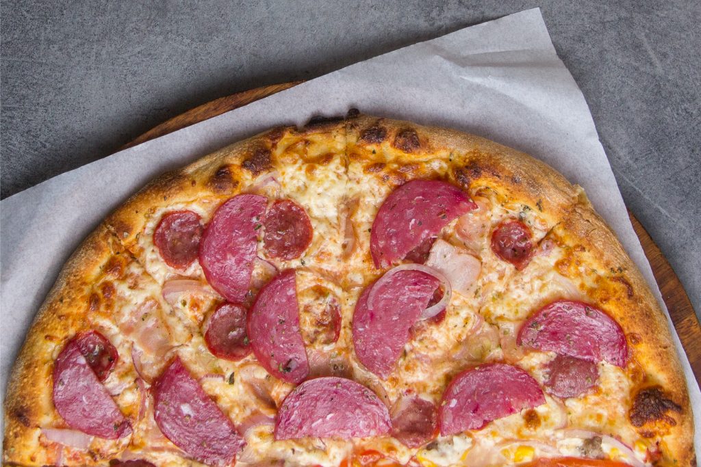 chorizo - salame - tocino - cebollas blanca y morada - Mozzarella - Salsa A Elección.